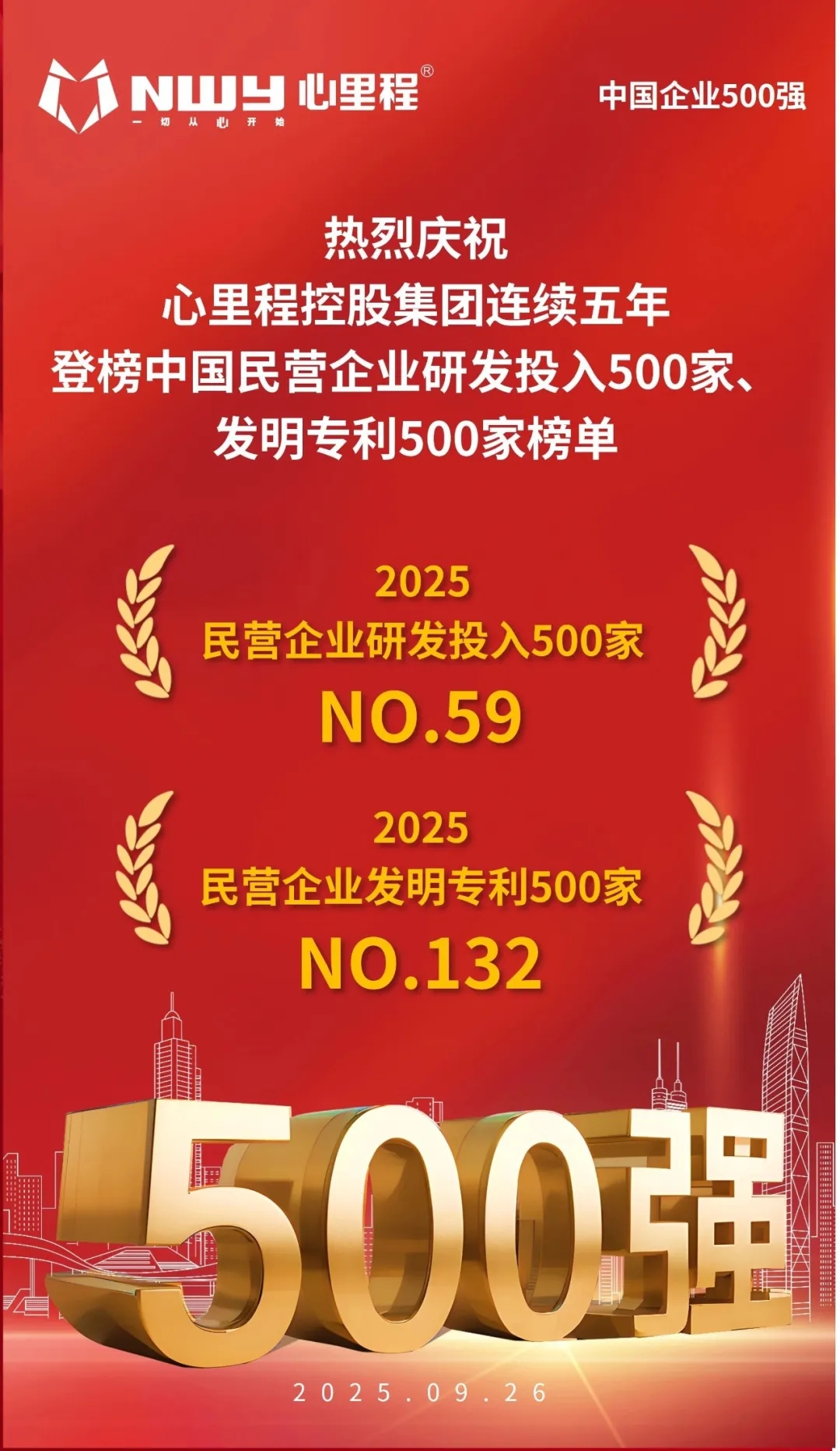 心里程集團(tuán)榮登2025民營(yíng)企業(yè)研發(fā)投入500家第59位